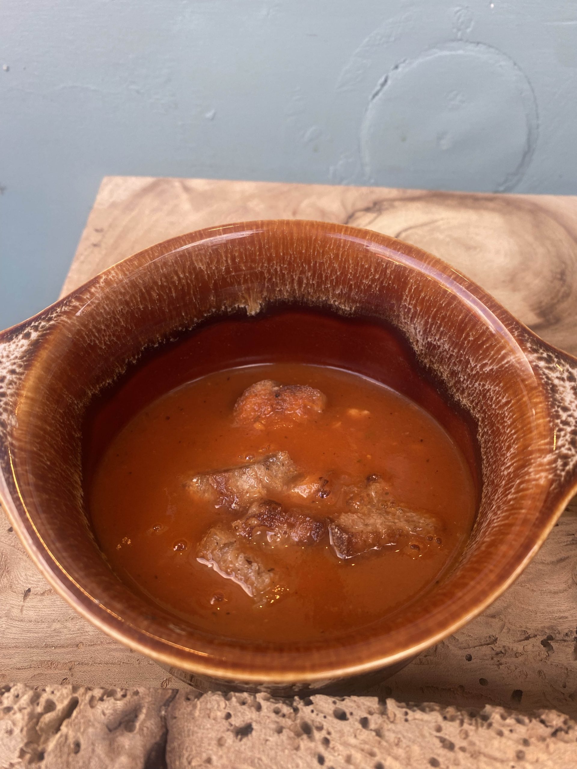 A clean simple soup made with roasted tomatoes, peppers and garlic with a finishing note of basil.